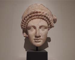 Not only are the exhibits phenomenal, the atmosphere is perfect. Jim and I walked into the main salon to the soft strains of contemporary jazz underscored by the gurgle of indoor fountain, and after purchasing a reasonably priced glass of wine & bottled, imported beer, proceeded to admire our surroundings. Roman statuary sculpted in the Greek tradition, to be specific.